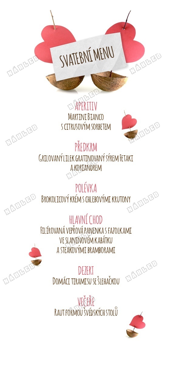Text u svatebního menu je pouze ilustrativní. Dodejte si svůj vlastní a my Vám jej upravíme. Svatební menu, oznámení, pozvánky, jmenovky, harmonogram svatby, prostírání, a dokonce i svatební samolepky a etikety na lahev vína můžete mít v jednom designu.