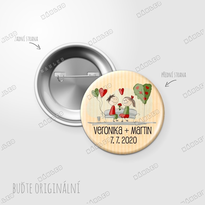 Placka, button, odznak k vaší svatbě nebo k rozlučce. Je určena k připevnění na oblečení, čepici, klobouk, aj. Všichni pozvaní si odnesou i hezký suvenýr na památku. Vybírat můžete ze dvou velikostí: 56mm a 37mm.