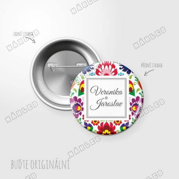 Placka, button, odznak k vaší svatbě nebo k rozlučce. Je určena k připevnění na oblečení, čepici, klobouk, aj. Všichni pozvaní si odnesou i hezký suvenýr na památku. Vybírat můžete ze dvou velikostí: 56mm a 37mm.